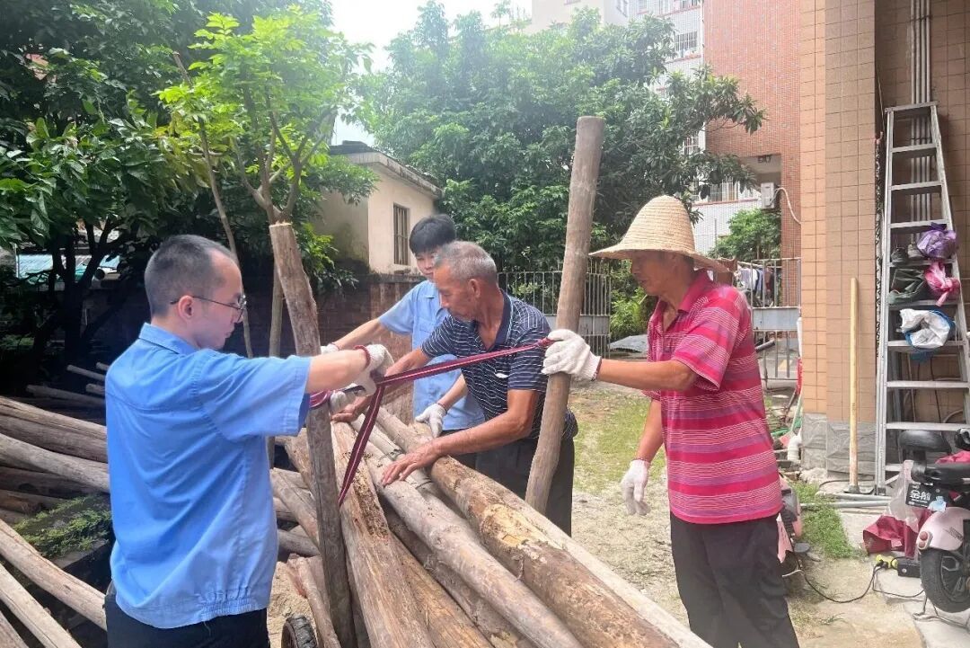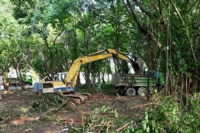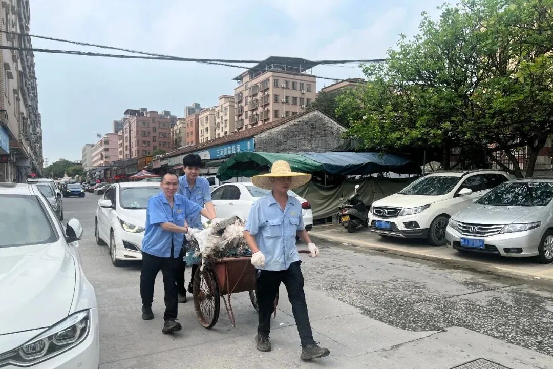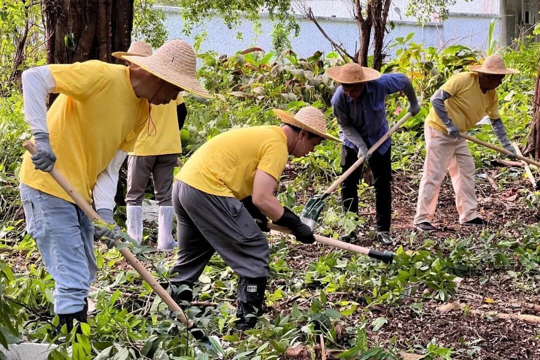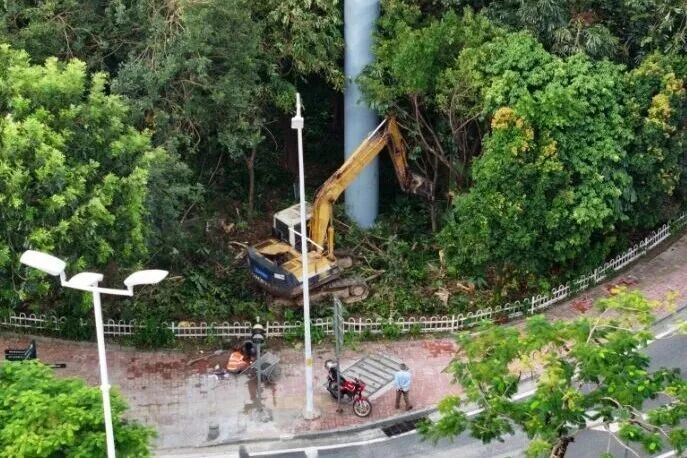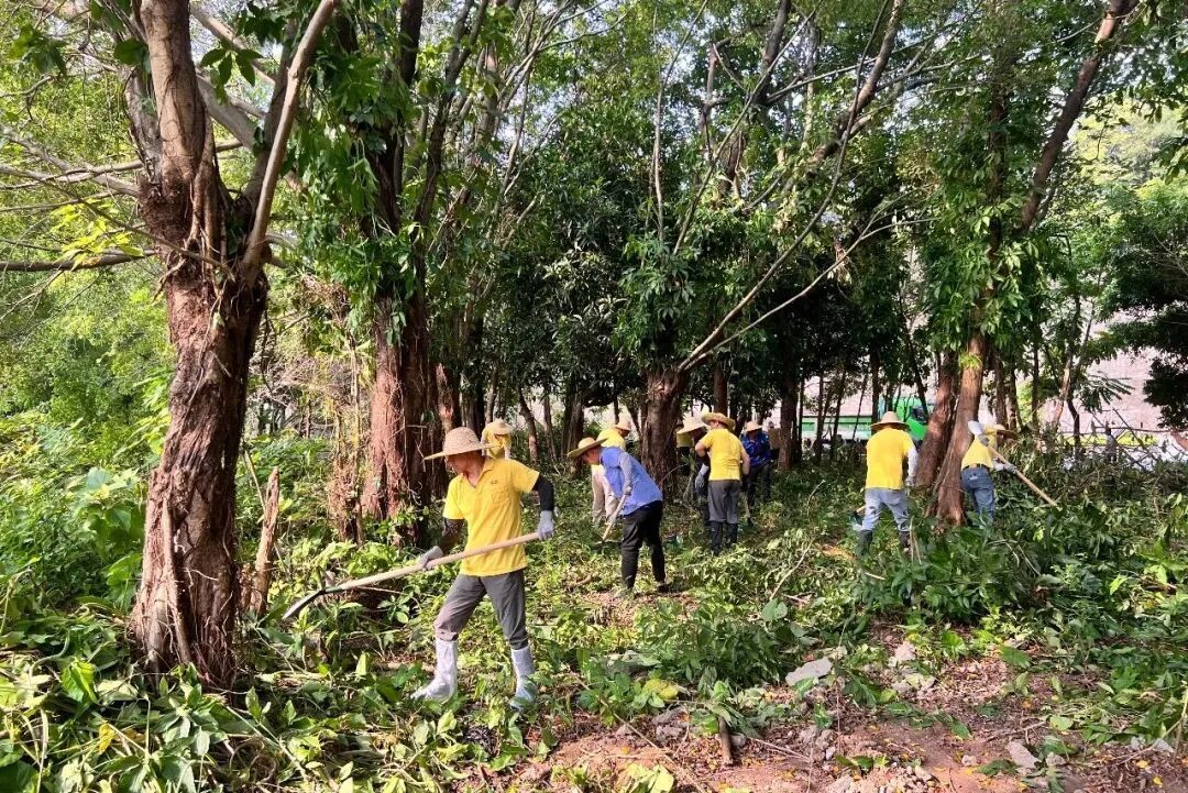 在沙坪街道铁夫路与人民路交汇处,机器轰鸣声中,多台大型挖掘机挥动铁臂,铲除杂草丛生的蚊媒孳生地。鹤山市东古调味品有限公司20多名员工则手持锄头、镰刀等工具,细致清理绿化带内的杂草和垃圾。