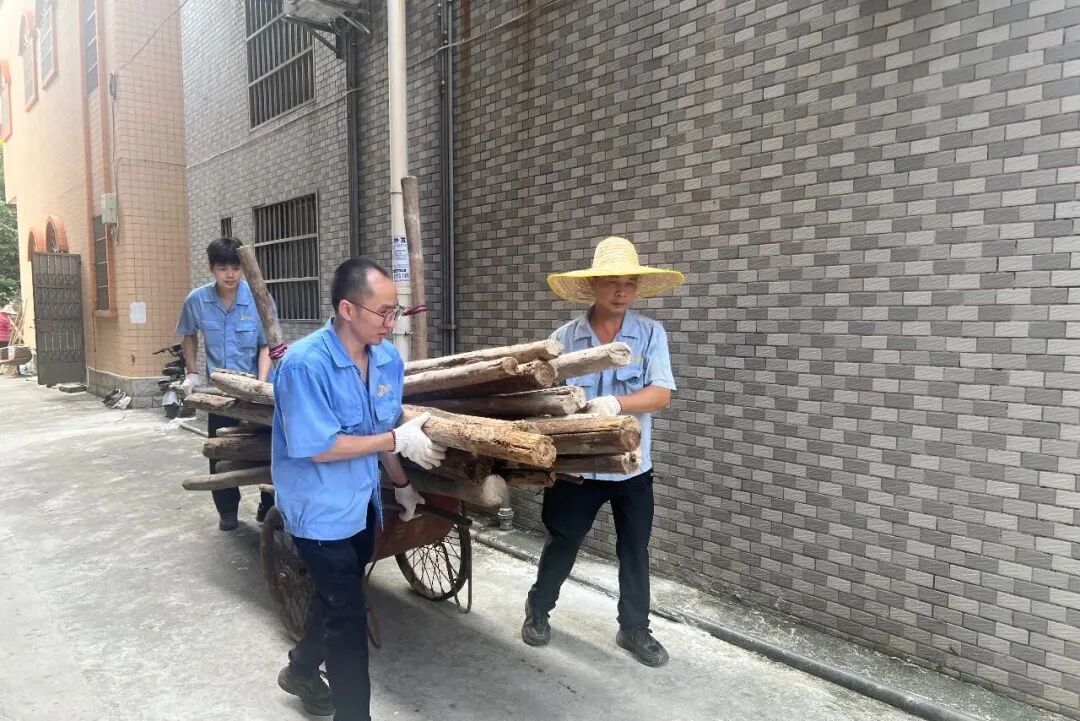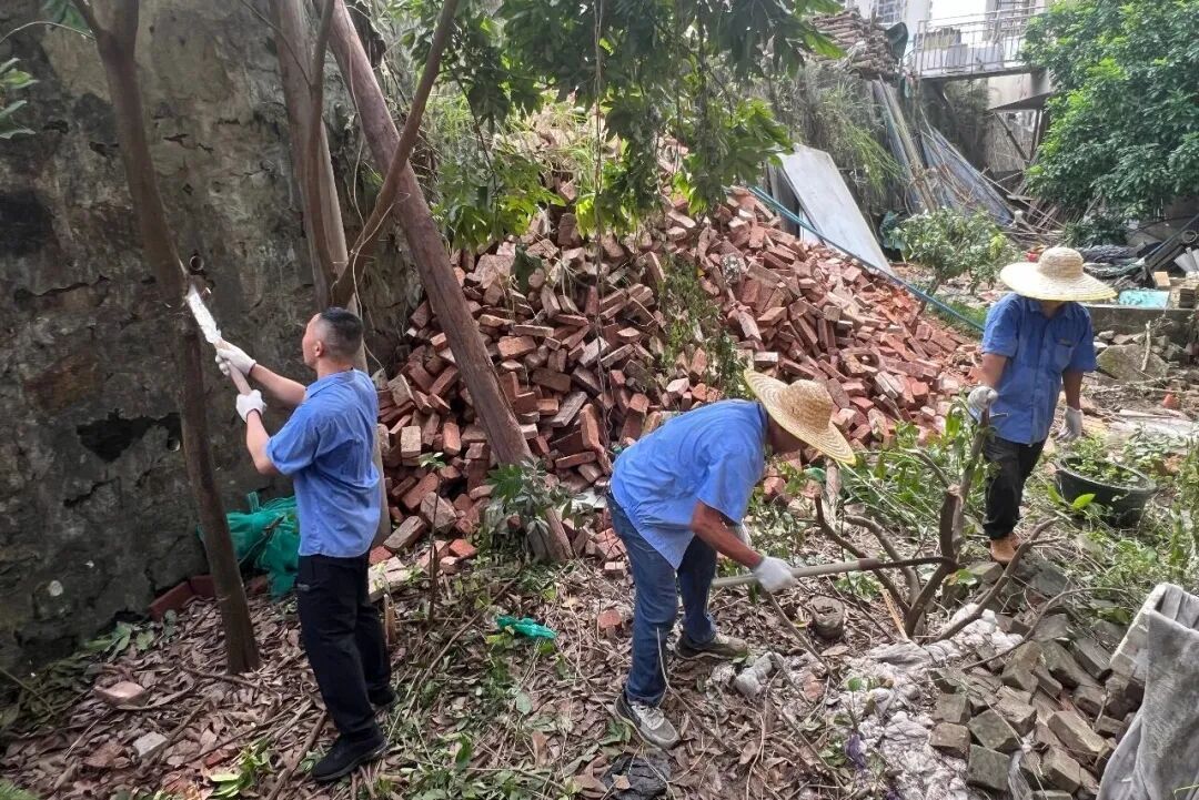 10月1日,假期首日,鹤山市德兴环球电缆有限公司迅速组织50名员工,调配两台挖掘机,以“小组分区清剿”的模式,对沙坪街道镇南石岭始兴村的危旧空置房、闲置空地等卫生黑点展开集中清理。
